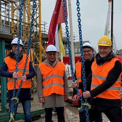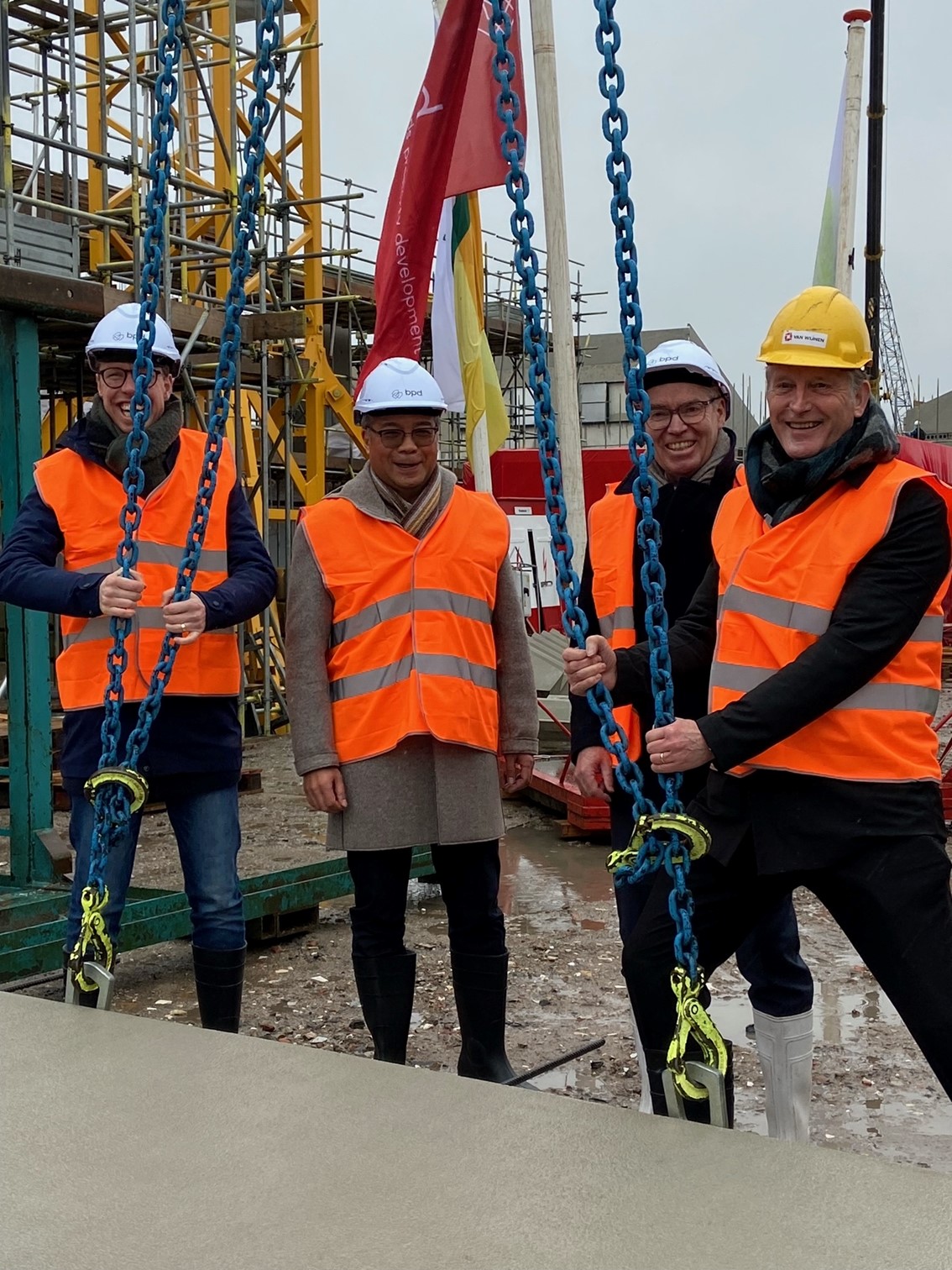 De bouw van twee appartementencomplexen in Proeftuin Erasmusveld in Den Haag is gestart. Dat werd onlangs gevierd door het plaatsen van een prefab wandelement. Wethouder Balster en vertegenwoordigers van BPD Woningfonds, Woonzorg Nederland, BPD | Bouwfonds Gebiedsontwikkeling en bouwer Van Wijnen waren aanwezig om samen te vieren dat er 136 betaalbare woningen aan de woningvoorraad worden toegevoegd.