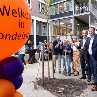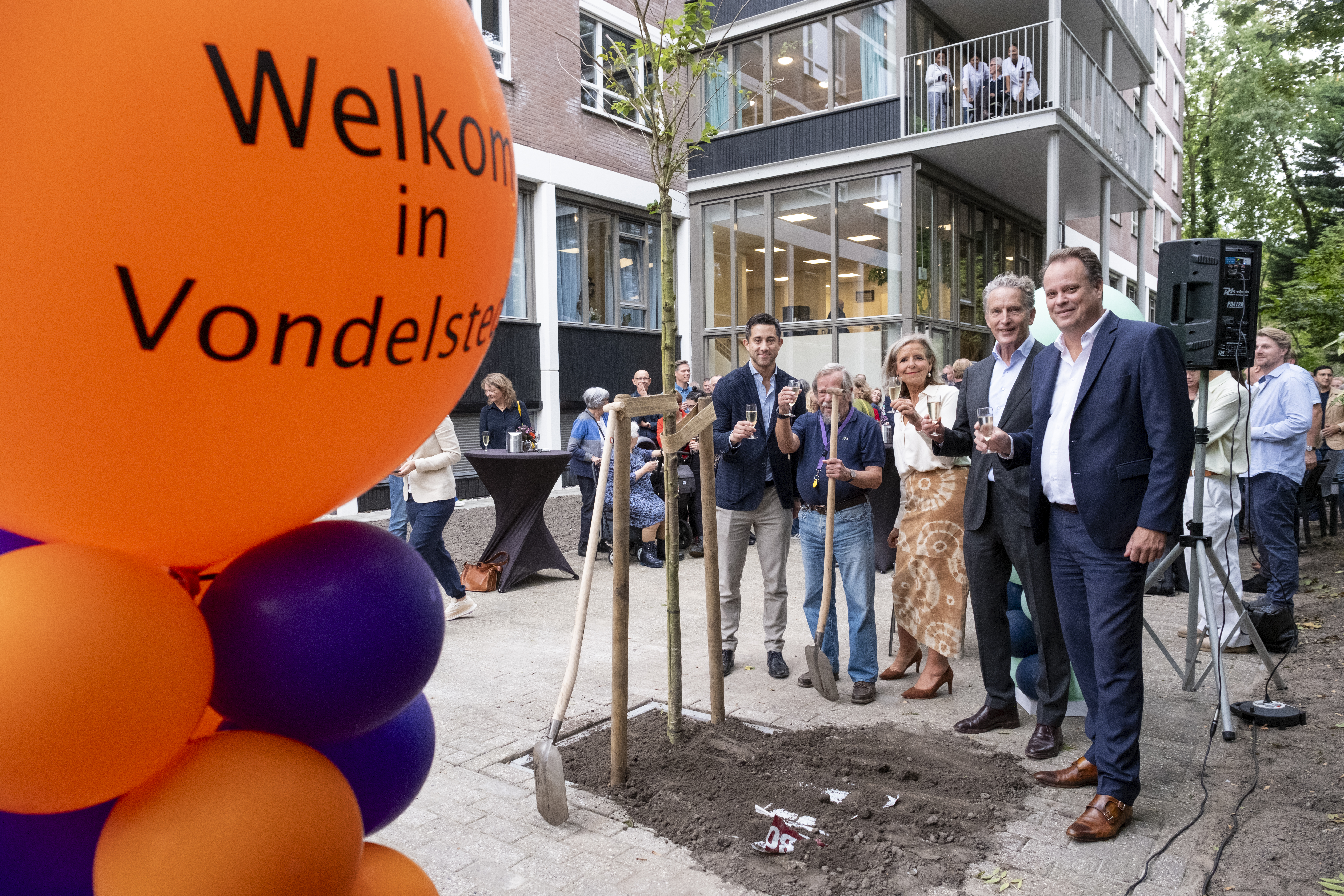 Onder het genot van een hapje en een drankje vierden we samen met andere bewoners, zorginstelling Amsta, wethouder Alexander Scholtes en de bestuurders dit heuglijke moment. De wethouder plantte samen met bewoner Paul een boom, als symbool voor wonen en zorg voor ouderen vlakbij het groene Vondelpark.