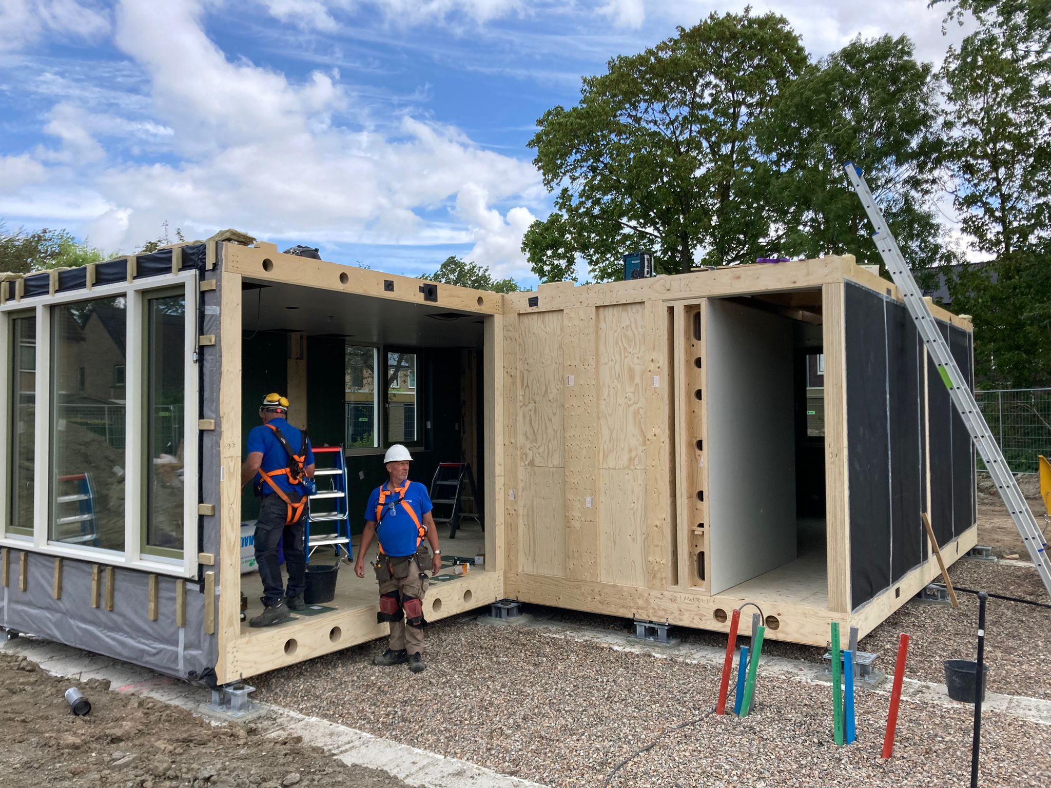 Het project is opgedeeld in twee bouwfases, zodat de meeste bewoners niet naar een andere locatie hoeven te verhuizen. Een deel van de woningen is gesloopt, het terrein is bouwrijp gemaakt en de fundatie voor de eerste vijf woningen is reeds aangebracht. Tegelijkertijd is Koopmans in haar assemblagehal geWOONhout in Wehl bijna klaar met de productie van de modules. Koopmans start medio juli met de montage op locatie. Daarna is het mooie resultaat van deze duurzame, circulaire en levensloopbestendige woningen snel zichtbaar.