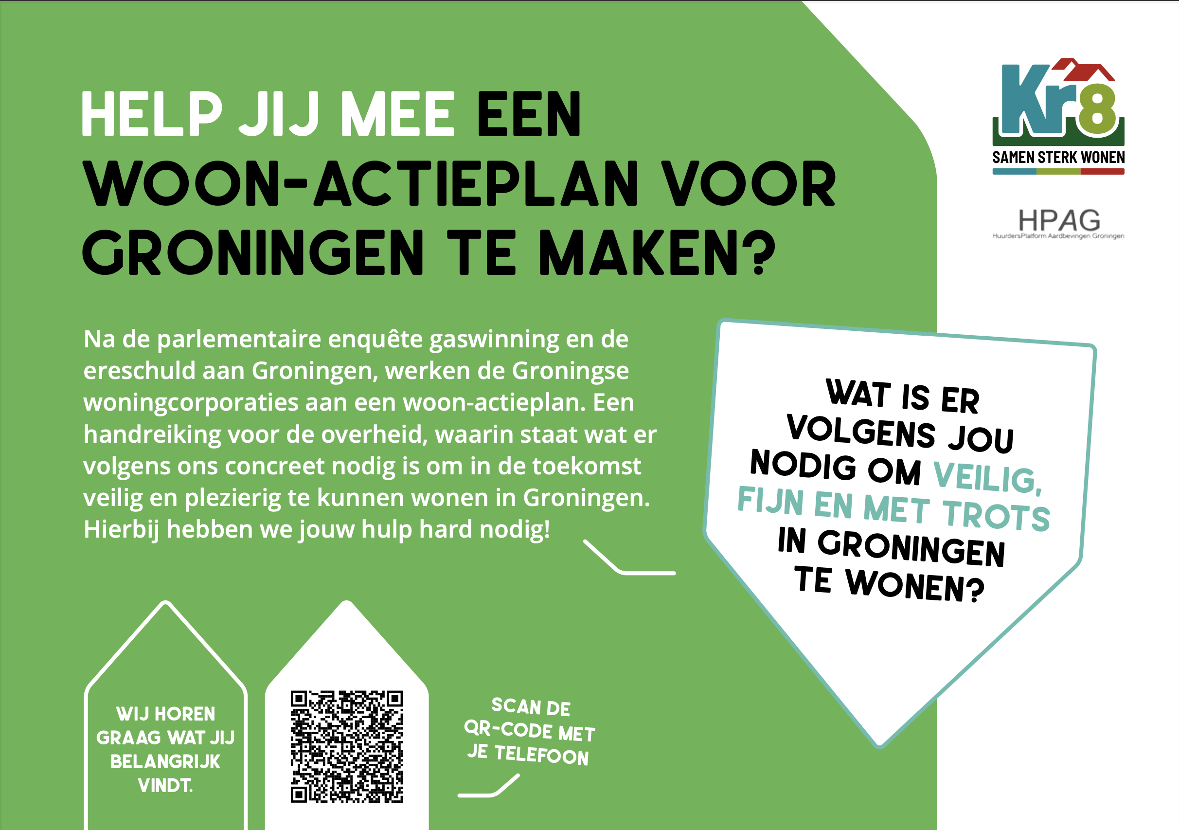 Na de parlementaire enquête gaswinning en de ereschuld aan Groningen, werken de Kr8-woningcorporaties – Woonzorg Nederland deel van uitmaakt - aan een woon-actieplan. Een handreiking voor de overheid, waarin staat wat er volgens ons concreet nodig is om in de toekomst veilig en plezierig te kunnen wonen in Groningen. Hierbij is de hulp huurders in het aardbevingsgebied hard nodig.